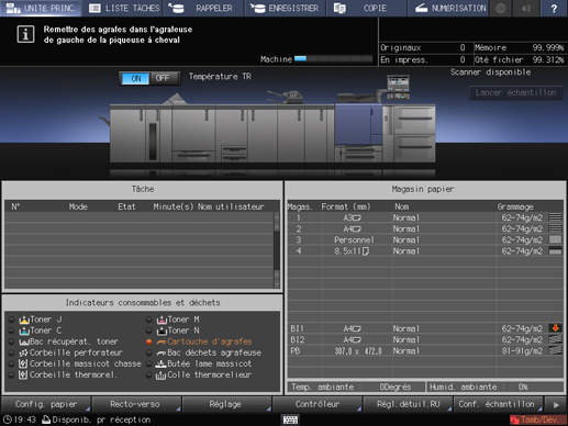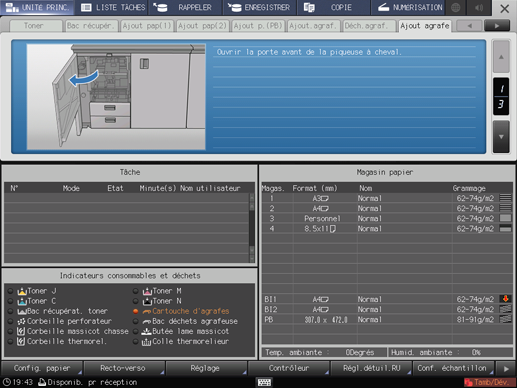L'indicateur Cartouche d'agrafes dans la zone [Indicateurs consommables et déchets] de l'écran [UNITÉ PRINC.] s'allume en rouge et la couleur du texte devient jaune.