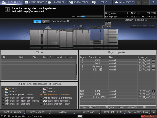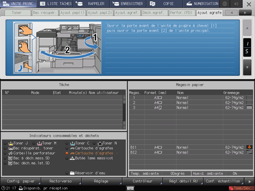 L'indicateur Cartouche d'agrafes dans la zone [Indicateurs consommables et déchets] de l'écran [UNITÉ PRINC.] s'allume en rouge et la couleur du texte devient jaune.