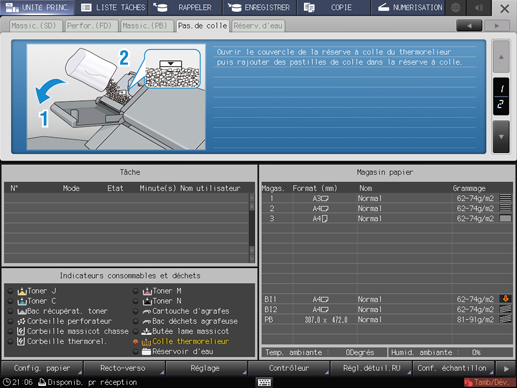 Lorsque le thermorelieur PB-503 manque de pastilles de colle, le préchauffage du relieur ne peut intervenir et l’opération de reliure n'est pas disponible. Dans ce cas, le message suivant apparaît dans la zone de message de l'écran.