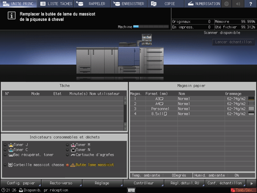 Cette machine massicote les jeux imprimés par un dispositif comprenant une lame et sa butée. Cette butée, même si elle présente une grande longévité, n'en reste pas moins un consommable, à remplacer de temps à autre. Dans ce cas, le message suivant apparaît dans la zone de message de l'écran.
