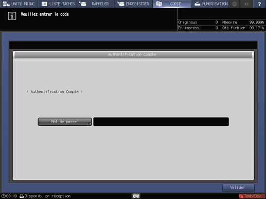 Si le mode de sécurité renforcée est activé, l'écran [Authentification utilisateur] ou [Authentification compte] est affiché chaque fois qu'un utilisateur tente d'utiliser une fonction qui requiert une authentification. Dans ce cas, tout mot de passe de moins de 8 caractères à un octet n'est pas authentifié. En cas de saisie incorrecte du mot de passe pendant l'authentification, l'utilisateur doit attendre 5 secondes avant de pouvoir entrer à nouveau le mot de passe.