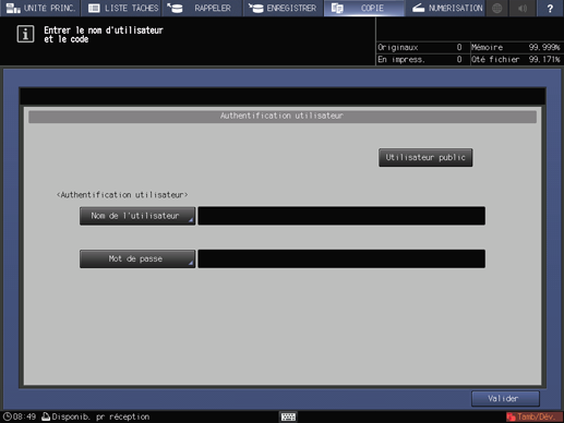 Si les utilisateurs publics sont autorisés, vous pouvez utiliser la machine en tant qu'utilisateur public en appuyant sur la touche [Utilisateur publique] affichée dans la partie supérieure droite de l'écran [Authentification utilisateur]. L'administrateur configure les fonctions disponibles aux utilisateurs publics ainsi que la limite haute de sortie.