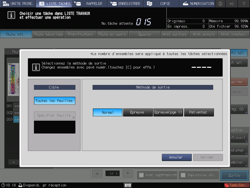 Indiquez les feuilles à sortir en sélectionnant [Toutes les feuilles] ou [Spécifier feuille]. Si vous sélectionnez une tâche en attente provenant de la liste tâches en cours ou si vous sélectionnez plusieurs tâches, [Spécifier feuille] n'est pas disponible.