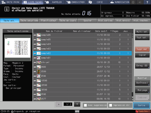 Sur l'écran tactile de l'imprimante, appuyez sur [LISTE TRAVAUX].