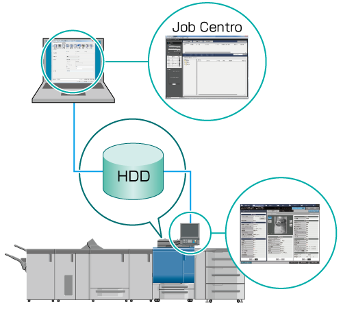 Cette section décrit la procédure d'édition des paramètres d'impression d'une tâche en attente à l'aide de l'écran tactile de la machine ou à l'aide de Job Centro.