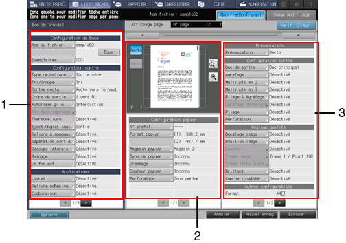 2. Volet central de l'écran | Affichage image d'aperçu | Affiche l'image d'aperçu du fichier sélectionné. Vous pouvez afficher un aperçu de l'image recto et verso d'un original 2 faces et vérifier l'image de rotation page ou le sens de sortie de l'image. Sur l'écran de prévisualisation, vous pouvez définir les repères cadrage, la position d'image ou la fonction Décalage d'image. |