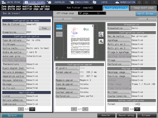Les opérations dans Job Centro diffèrent de l'écran tactile de l'imprimante et vous ne disposez pas des options de nouvel enregistrement ou d'écrasement des données. Pour effectuer un nouvel enregistrement sous une autre tâche, copiez une tâche originale sur l'écran [Ret. Tâche] de Job Centro avant de procéder aux modifications souhaitées.