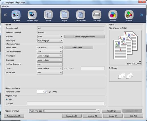 [De base] | Format original, orientation original, magasin, profil papier / information papier / nombre de copies / plage de pages |