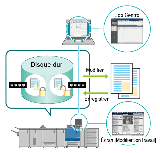 La fonction tâche sécurisée modifie les paramètres d'impression, les données par page ou imprime les données via l'écran tactile de la machine. Vous pouvez également utiliser Job Centro pour modifier une tâche sécurisée. Par contre vous ne pouvez pas modifier une tâche en cours de modification à l'aide du panneau de la machine ni modifier d'autres éléments que le nom de fichier, le nombre d'exemplaires, ni modifier une tâche qui est exclusivement modifiable sur le panneau de contrôle de la machine.