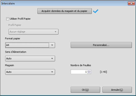 Sur l'écran [Intercalaire], spécifiez le format de papier, le sens d'introduction ainsi que le magasin et cliquez sur [OK].
