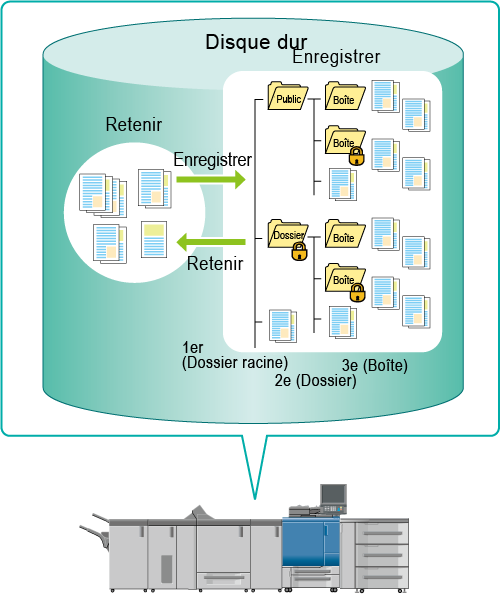 Utilisation de l'écran tactile de l'unité principale ou de Job Centro pour enregistrer une tâche en attente dans un dossier créé sur le disque dur. Rappel d'une tâche enregistrée sur le disque dur comme tâche en attente.