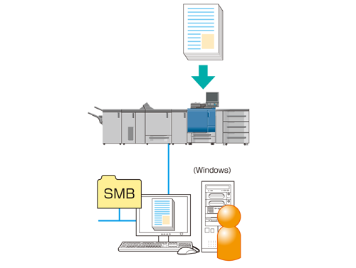 Vous pouvez envoyer un gros volume de données numérisées sur la machine au dossier partagé créé sur l'ordinateur Windows (prise en charge du protocole SMB) sur le réseau.