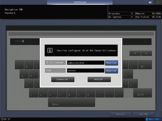 L'écran d'authentification s'affiche. Appuyez sur [Modifier] pour l'identifiant utilisateur et le mot de passe et entrez les informations d'authentification.