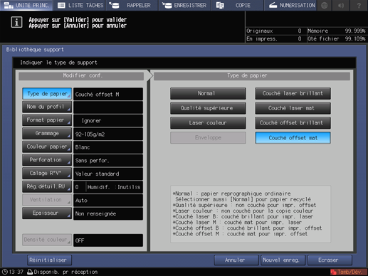 Vous pouvez régler [Type de papier] / [Nom profil papier] / [Format papier] / [Grammage] / [Couleur papier] / [Perforation] / [Calage R°V°] / [Régl.détuil.RU] / [Epaisseur] / [Densité couleur].