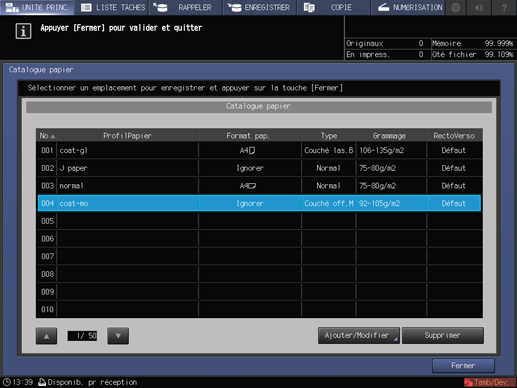 Vous pouvez modifier le réglage en sélectionnant le profil papier enregistré et en appuyant sur [Ajouter/Modifier]. Pour supprimer un profil papier enregistré, appuyez sur [Supprimer].