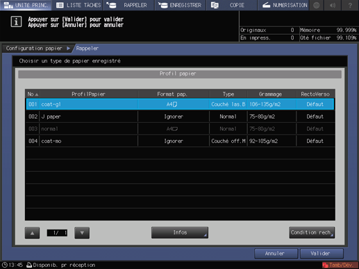 Les réglages du profil papier sélectionné doivent correspondre à ceux du magasin. Si les réglages papier enregistrés ne correspondent pas à ceux du magasin, le réglage papier est estompé et ne peut pas être sélectionné. Dans ce cas, sélectionnez un autre magasin.