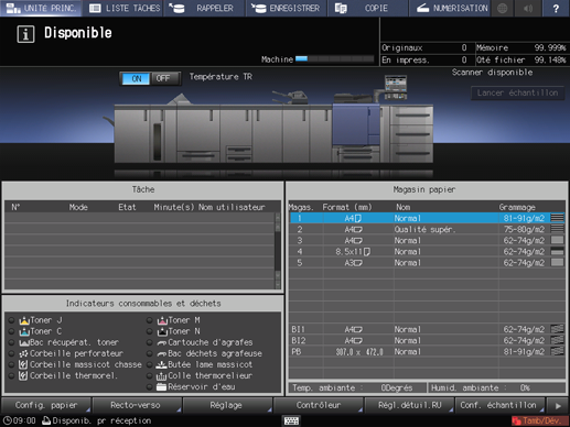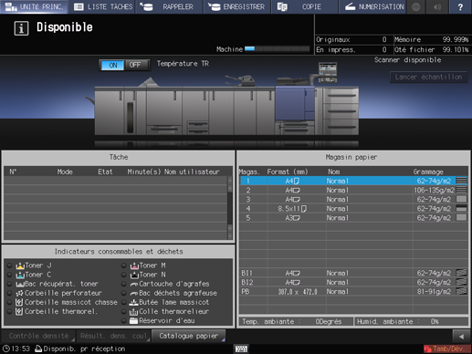 Sur l'écran tactile de l'imprimante, appuyez sur [Réglage papier] sur l'écran [MACHINE].