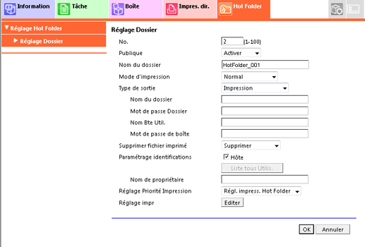 Cliquez sur l'onglet [Réseau] - [Configuration Hot Folder] - [Configuration Hot Folder] successivement