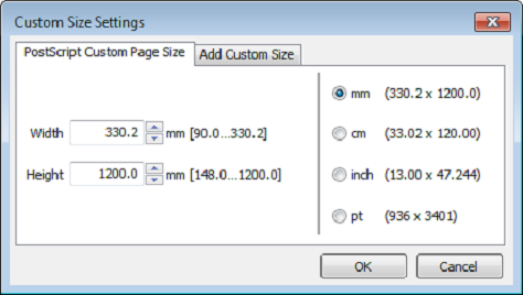 Cliquez sur [Personnel] pour format document et format papier respectivement. Entrez les valeurs 330,2 mm / pour la largeur (dans le sens de la largeur) / 13", 1200,0 mm / 47.24" pour la hauteur (dans le sens de la longueur) et cliquez sur [OK].