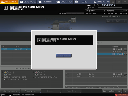 Si l'unité bannière MK-740 est installée sur le bac de sortie OT-510, OT-511, sur l'unité de finition FS-531, FS-532 ou FS-612, chaque fois que 10 feuilles sortent dans le bac auxiliaire, le message « Retirez le papier du magasin auxiliaire et touchez OK » s'affiche et la sortie est interrompue indépendamment du format papier. Retirez le papier du bac auxiliaire, appuyez sur [Valider] à l'écran. Appuyez sur la touche Départ du panneau de contrôle pour lancer l'impression.