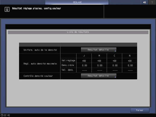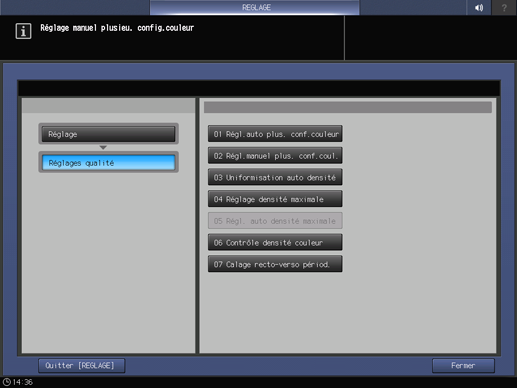 Réglage collectif automatique des couleurs. Cet élément de menu doit s'afficher sur la machine équipée de l'optimiseur de qualité IQ-501.