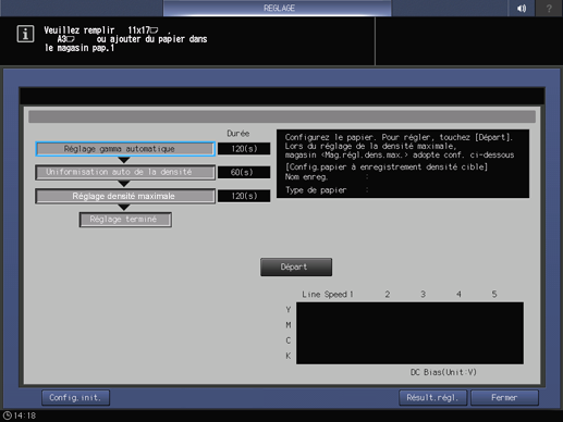 4. Changez les paramètres de votre choix (Écran cible de réglage, Réglage additionnel, Magasin réglage densité maximale ou Magasin réglage).