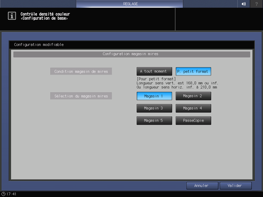 Explication supplémentairePour utiliser le magasin et le papier définis par Sélection du magasin mires pendant la sortie de toutes les mires de contrôle de densité couleur, sélectionnez A tout moment. Pour utiliser le magasin et le papier définis par Sélection du magasin mires pendant la sortie des mires petits formats, sélectionnez P. petit format.