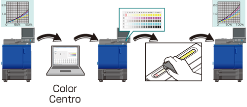 Mesurez la densité de sortie des couleurs C, M, J et N sur une mire à l'aide de l'instrument et retournez les résultats au contrôleur. Ce retour d'information est utilisé par le contrôleur pour exécuter l'étalonnage automatique de la densité de sortie en référence à la densité cible prédéfinie. Cet étalonnage active une densité de sortie proche de la densité cible.