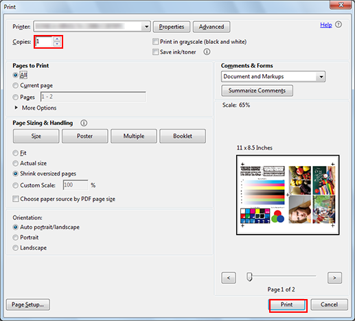 5. Sur l'écran Impression, entrez le nombre de Copies et cliquez sur Impression. Après l'impression, vérifiez les résultats.