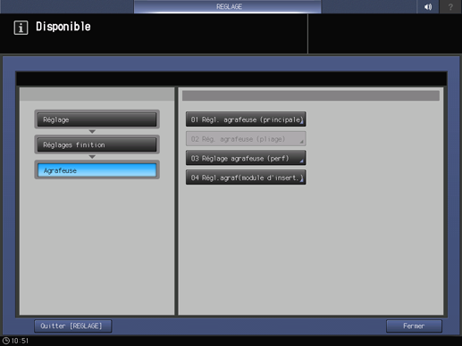 5. Appuyez sur Réglage agrafeuse (perf) du menu Agrafeuse.