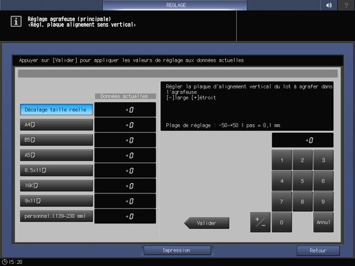 Appuyez consécutivement sur Réglages finition, Agrafeuse, Rég. agrafeuse (principale) et Réglage plaque alignement FD .