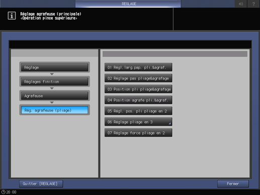 Appuyez consécutivement sur Réglages finition, Agrafeuse, Réglage agrafeuse (pliage) et Réglage force pliage en 2 .