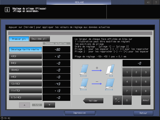 Sélectionnez Pliage 2 et utilisez le clavier de l'écran tactile pour entrer la valeur de réglage.