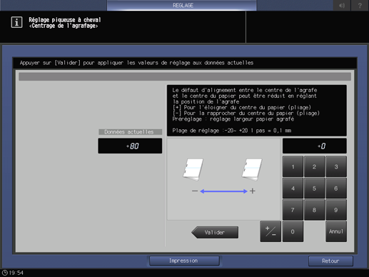 Si un réglage est nécessaire, appuyez sur Retour réglage pour revenir à l'écran Centrage de l'agrafage.
