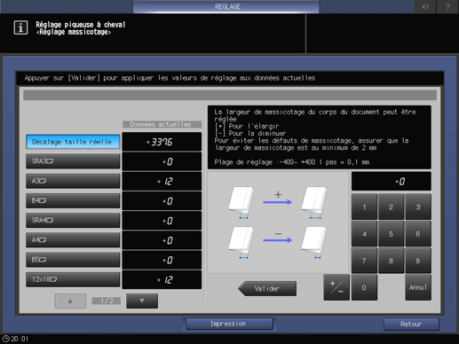 Explication supplémentaireLa valeur entrée doit permettre un massicotage couverture d'au moins 2,0 mm. Si le massicotage est inférieur à 2,0 mm, le massicotage risque d'être mal exécuté.