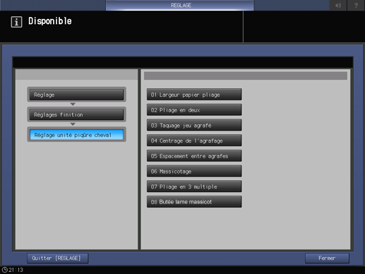Appuyez successivement sur Réglages finition, Réglage unité piqûre cheval et Butée lame massicot.