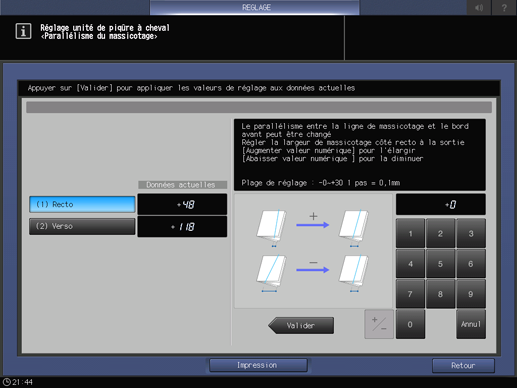 Appuyez successivement sur Réglages finition, Réglage unité piqûre cheval et Parallélisme du massicotage.