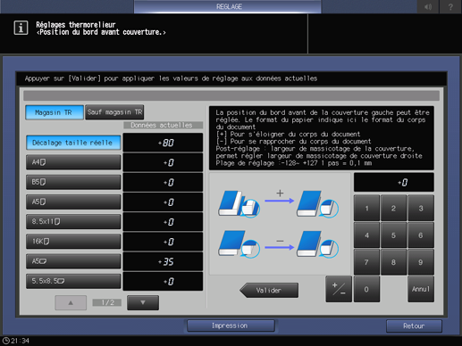Appuyez consécutivement sur Réglages finition, Thermorelieur et Position bord avant couverture.