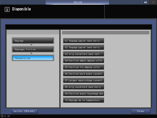 Appuyez sur Réglages finition, Thermorelieur et Alignement couverture sens latéral consécutivement.