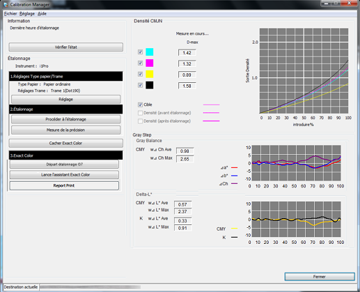 10. Vérifiez les résultats de mesure (densité CMJN et niveau de gris) sur l'écran Calibration Manager.