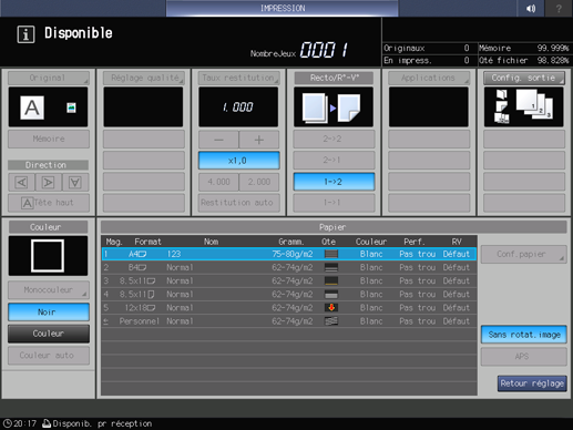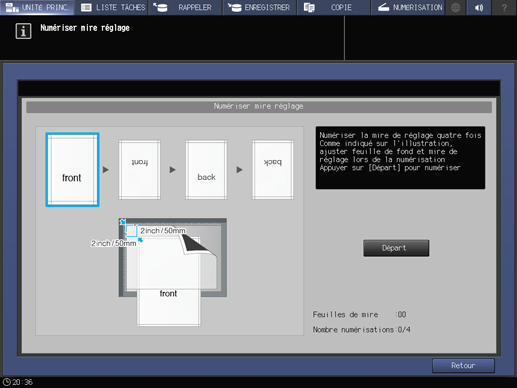3. Affichez l'écran IMPRESSION de la feuille de fond et appuyez sur la touche Départ du panneau de contrôle. Vérifiez que la sortie est terminée, puis appuyez sur Retour réglage.