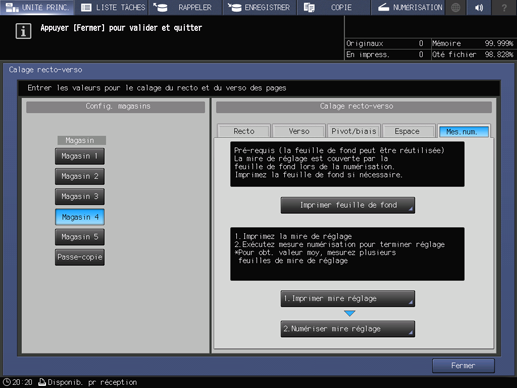 • Le réglage Mes.num. pour la numérisation des mires de réglage n'est pas disponible sur une machine qui n'est pas équipée du scanner (vitre d'exposition).