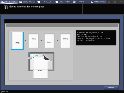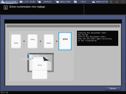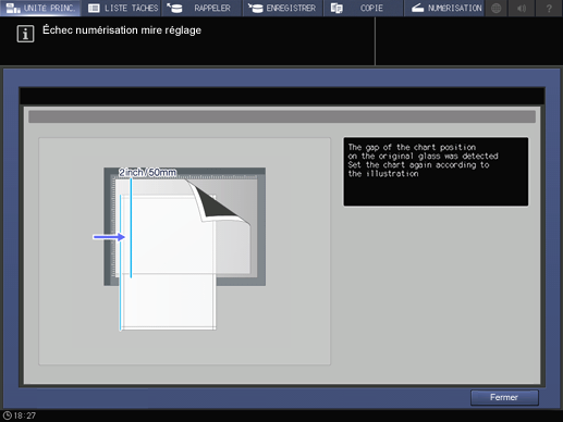 • Explication supplémentaireLe message Échec numérisation mire réglage est peut-être affiché. Suivez les instructions à l'écran pour placer correctement la mire de réglage et la feuille de fond avant d'appuyer sur Fermer.