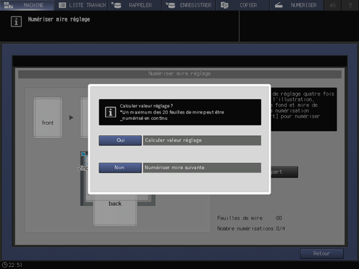 • Explication supplémentaireA la fin des quatre séries de numérisation, un dialogue s'affiche pour le calcul de la valeur de réglage.