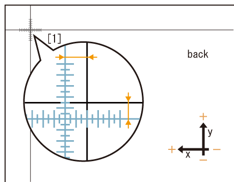du point [1] est décalé de 2,0 mm vers la gauche (valeur positive de l'axe des X) et de 1,5 mm vers le bas (valeur négative de l'axe des Y) comme illustré dans la figure, appuyez successivement sur 20+/- et entrez -2,0 pour corriger et déplacer de 2,0 mm vers la droite (valeur négative de l'axe des X) la ligne bleue au verso. Appuyez également successivement sur 15 et entrez +1,5 pour corriger et déplacer vers le haut (valeur positive de l'axe des Y) de 1,5 mm sur l'axe des Y.