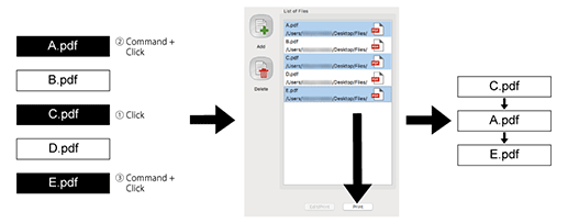 Si la liste de fichiers de AccurioPro Hot Folder est sélectionnée, les fichiers sont sortis dans l'ordre dans lequel ils sont sélectionnés.