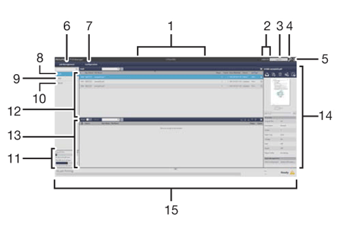 12 | Liste des conteneurs de tâche | Si vous sélectionnez En attente, Disque dur, ou Sécurisé dans l'arborescence de gauche, la liste des tâches sélectionnées s'affiche. |