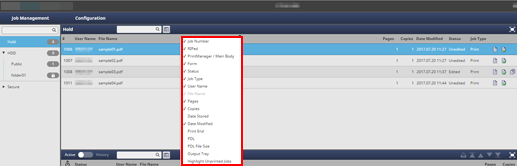Explication supplémentaireLorsque vous cochez la case Marquer les tâches non imprimées, les libellés des tâches listées en tant que Non imprimé sous Fin d'impression sont affichés en bleu dans la liste des tâches en attente, la liste des tâches sécurisées et la liste des tâches sur disque dur.