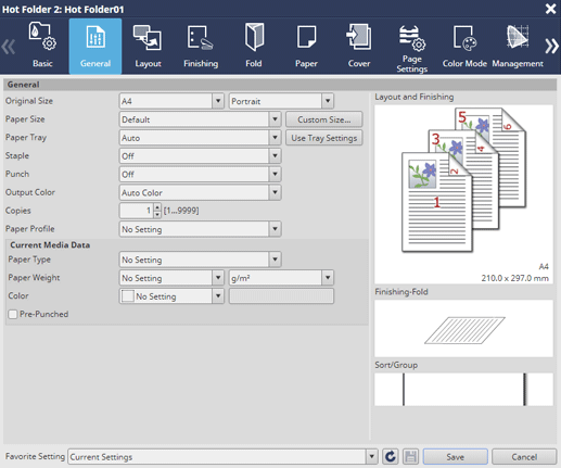 Les éléments de réglage de cet écran sont les mêmes que ceux de l'écran Général de l'écran Configuration des tâches, hormis Pages imprimées. Pour en savoir plus sur les éléments de configuration commune, voir Écran [Général].