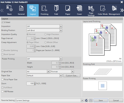 Les éléments de réglage de cet écran sont les mêmes que ceux de l'écran Mise en page de l'écran Configuration des tâches, hormis Insérer des pages vierges pour la couverture du livret. Pour en savoir plus sur les éléments de configuration commune, voir Ecran [Mise en Page].